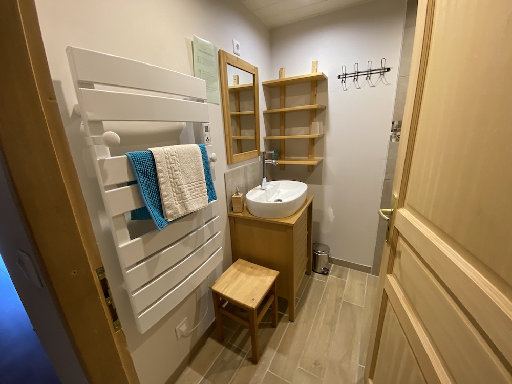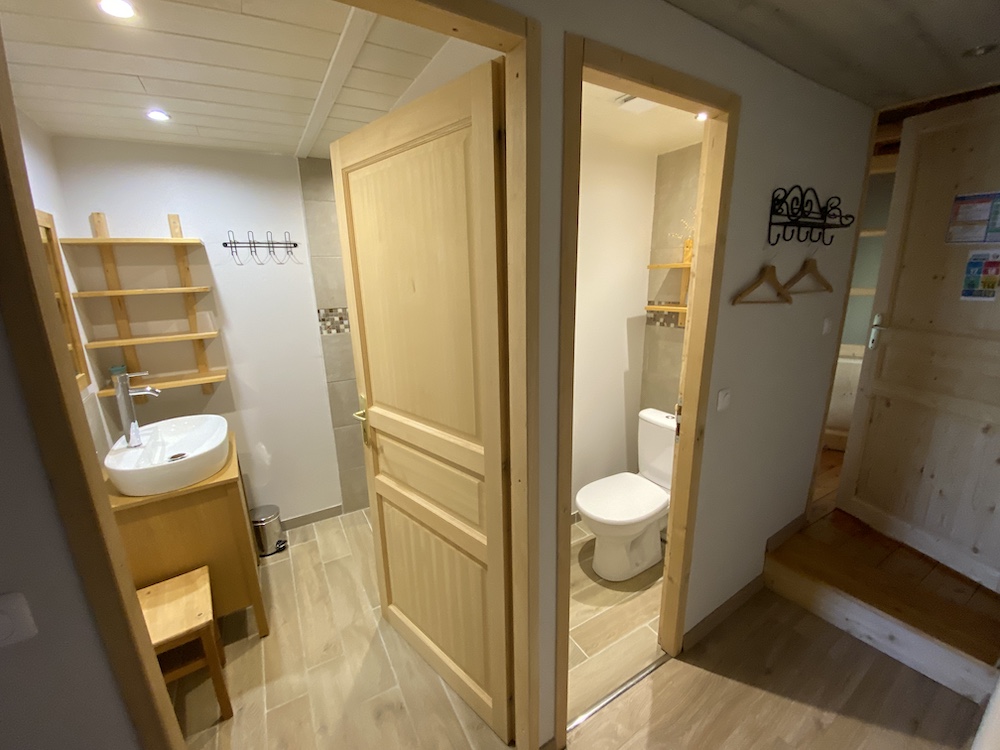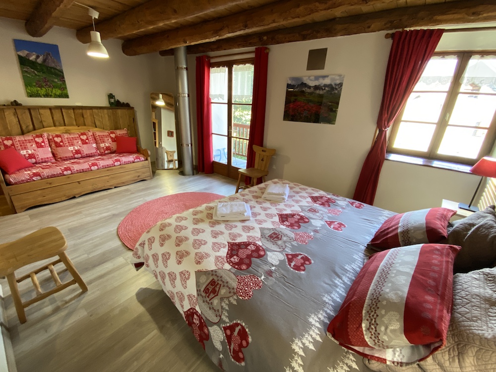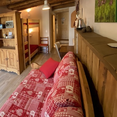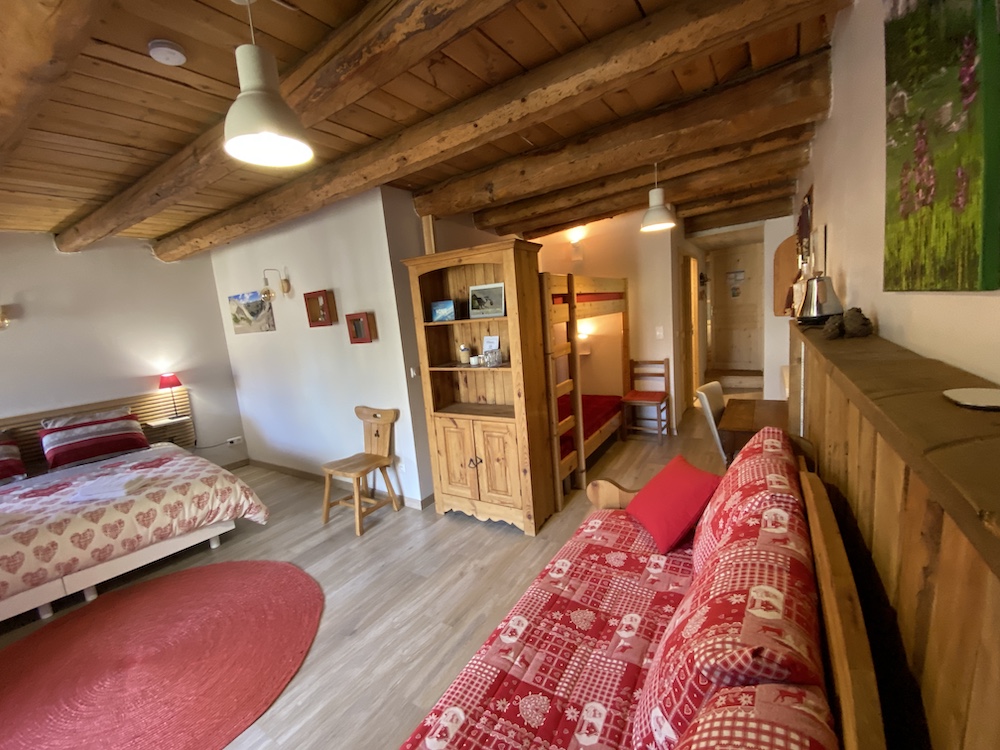 Cette chambre de 31m² peut accueillir jusqu'à 5 personnes max. Elle dispose d'un balcon privatif orienté plein sud. La pièce est aménagée d'un lit double (possibilité 2 lits simples), un lit superposé, et une banquette lit gigogne.